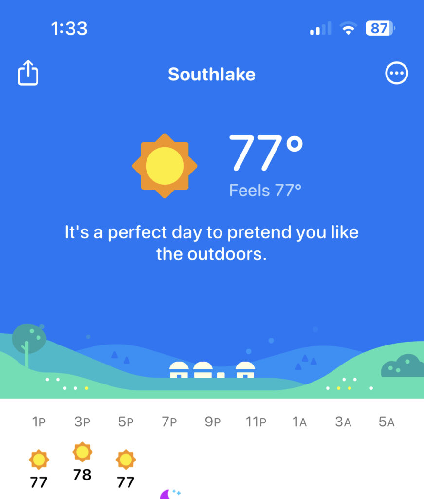 Now, I need to explain that I have a quirky weather app. It’s called Carrot and when you install it you can dial-in precisly how snarky you want it to be, on a scale from “bland,” to “somewhat snarky,” all the way up to “brutal.” I, of course, chose the “Snarky” setting. On typical days, the current weather summary includes a remark like this one, displayed just now as I’m writing this post: