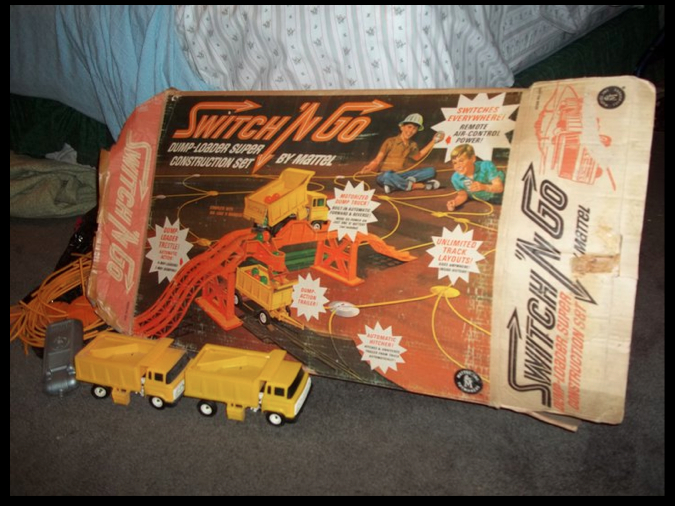 My sister sent me this picture and at first I didn’t recognize the trucks as being mine. But then I looked at the bridge on the box and neurons deep in my memory cells started firing. I also have a memory of assembling the plastic tubing that comprised the “track” that the battery powered trucks ran on.
